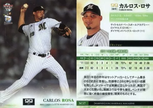Nombre comercial en japonés: BBM/レギュラーカード/BBM2012 千葉ロッテマリーンズ M37 [レギュラーカード] : カルロス・ロサ