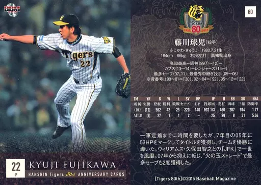 Nombre comercial en japonés: BBM/レギュラーカード/球団OB/BBM2015 阪神タイガース80周年カード 60 [レギュラーカード] : 藤川球児