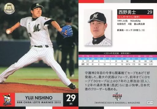 Nombre comercial en japonés: BBM/レギュラーカード/BBM2015 千葉ロッテマリーンズ M14 [レギュラーカード] : 西野勇士
