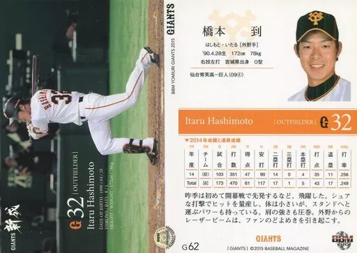 Nombre comercial en japonés: BBM/レギュラーカード/BBM2015 読売ジャイアンツ G62 [レギュラーカード] : 橋本到