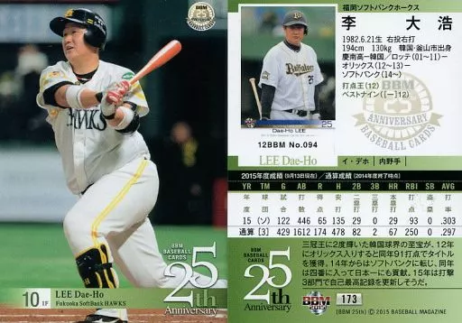 Nombre comercial en japonés: BBM/レギュラーカード/福岡ソフトバンクホークス/BBM2015 BBMベースボールカード25th Anniversary 173 [レギュラーカード] : 李大浩