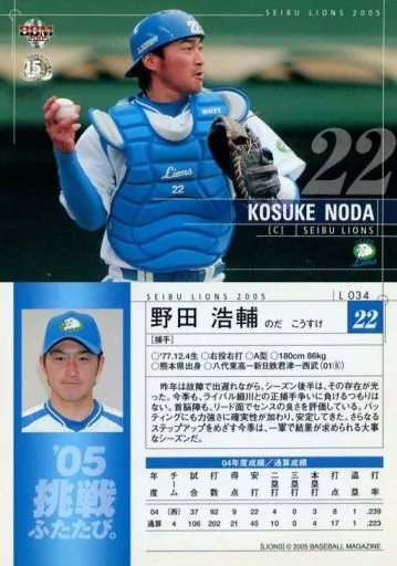 Nombre comercial en japonés: BBM/レギュラーカード/BBM2005 西武ライオンズ L034 [レギュラーカード] : 野田浩輔