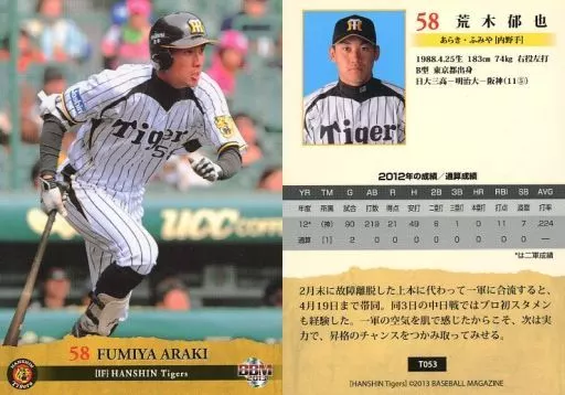 Nombre comercial en japonés: BBM/レギュラーカード/阪神タイガース/BBM2013 阪神タイガース T053 [レギュラーカード] : 荒木郁也