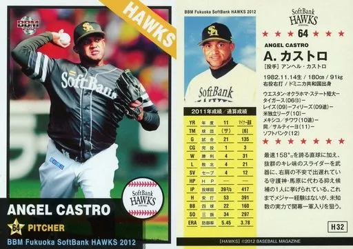 Nombre comercial en japonés: BBM/レギュラーカード/BBM2012 福岡ソフトバンクホークス H32 [レギュラーカード] : A.カストロ
