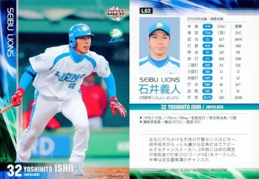 Nombre comercial en japonés: BBM/レギュラーカード/BBM2007 西武ライオンズ L62 [レギュラーカード] : 石井義人