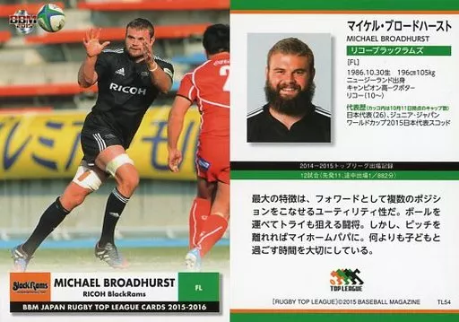 Nombre comercial en japonés: BBM/レギュラーカード/-/リコーブラックラムズブラックラムズ/BBM2015 ジャパン ラグビー トップリーグカード2015-2016 TL54 [レギュラーカード] : マイケル・ブロードハースト