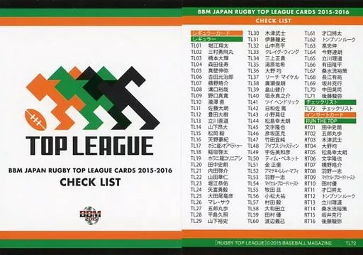 Nombre comercial en japonés: BBM/レギュラーカード/-/-/BBM2015 ジャパン ラグビー トップリーグカード2015-2016 TL72 [レギュラーカード] : チェックリスト