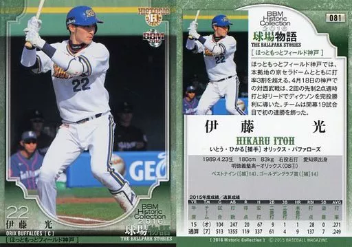 Nombre comercial en japonés: BBM/レギュラーカード/オリックス・バファローズ/BBM2016 ヒストリックコレクション 球場物語 081 [レギュラーカード] : 伊藤光