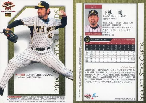 Nombre comercial en japonés: BBM/レギュラーカード/阪神タイガース/BBM2008 オールスターカード A11 [レギュラーカード] : 下柳剛