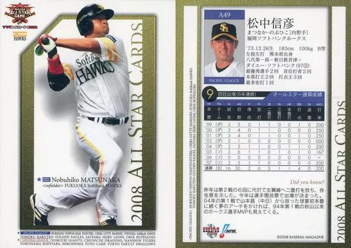 Nombre comercial en japonés: BBM/レギュラーカード/福岡ソフトバンクホークス/BBM2008 オールスターカード A49 [レギュラーカード] : 松中信彦