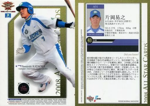 Nombre comercial en japonés: BBM/レギュラーカード/西武ライオンズ/BBM2008 オールスターカード A51 [レギュラーカード] : 片岡易之