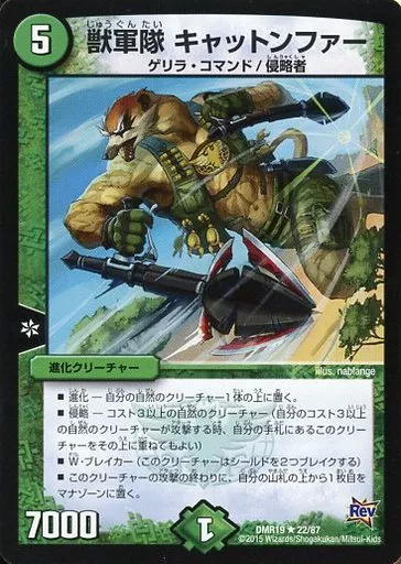 Nombre comercial en japonés: デュエルマスターズ/R/自然/[DMR-19]革命 拡張パック第3章 禁断のドキンダムX 22/87[R]:獣軍隊 キャットンファー