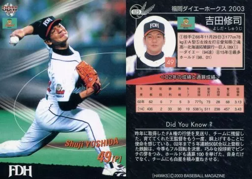 Nombre comercial en japonés: BBM/レギュラーカード/BBM2003 福岡ダイエーホークス 023 [レギュラーカード] : 吉田修司