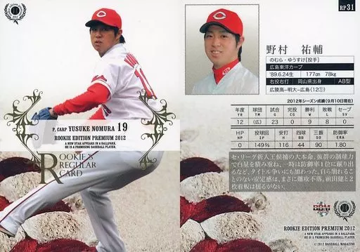 Nombre comercial en japonés: BBM/レギュラーカード/広島東洋カープ/BBM2012 ルーキーエディションプレミアム RP31 [レギュラーカード] : 野村祐輔
