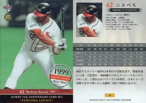 Nombre comercial en japonés: BBM/レギュラーカード/1999日本シリーズベストナイン/福岡ダイエーホークス/BBM2013 ホークス75周年「FUKUOKA LEGACY」 07 [レギュラーカード] : ニエべス