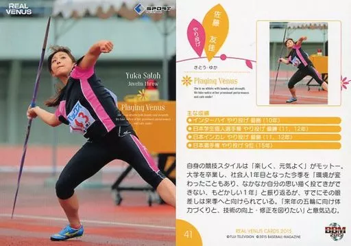 Nombre comercial en japonés: BBM/レギュラーカード/Playing Venus/やり投げ/BBM REAL VENUS CARDS 2015 41 [レギュラーカード] : 佐藤友佳