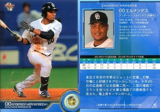 Nombre comercial en japonés: BBM/レギュラーカード/BBM2015 中日ドラゴンズ「逆襲の竜」 15 [レギュラーカード] : エルナンデス(金箔押しサイン入り)