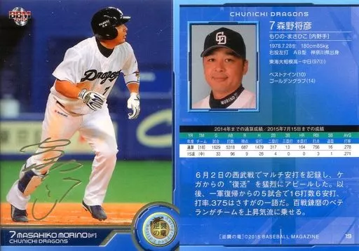 Nombre comercial en japonés: BBM/レギュラーカード/BBM2015 中日ドラゴンズ「逆襲の竜」 19 [レギュラーカード] : 森野雅彦(金箔押しサイン入り)