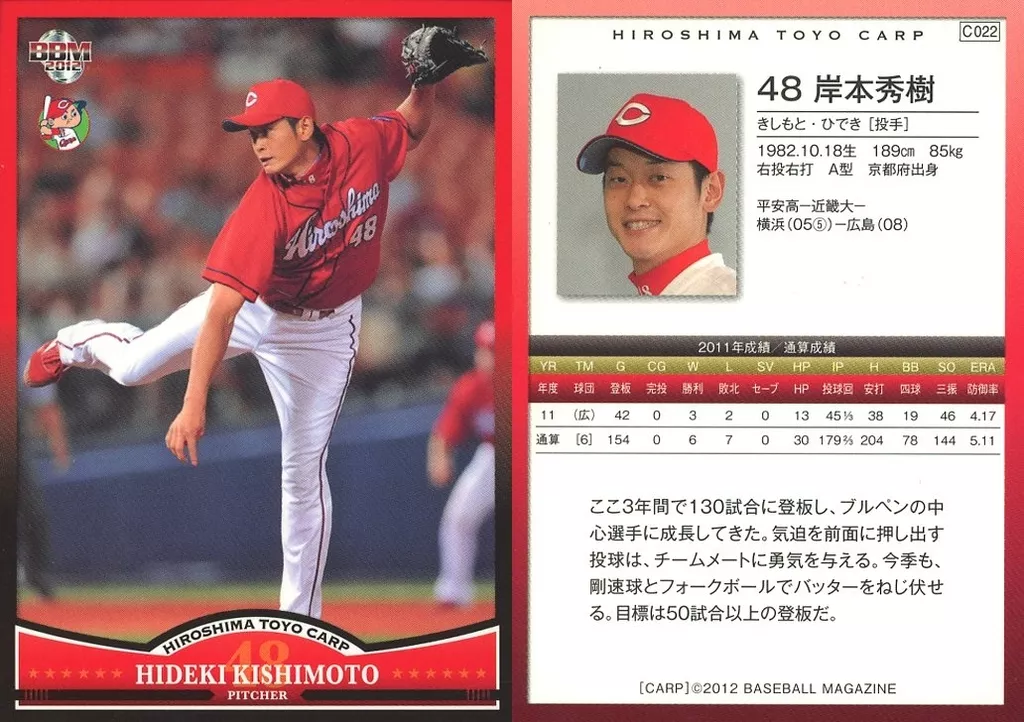 Nombre comercial en japonés: BBM/レギュラーカード/BBM2012 広島東洋カープ C022 [レギュラーカード] : 岸本秀樹