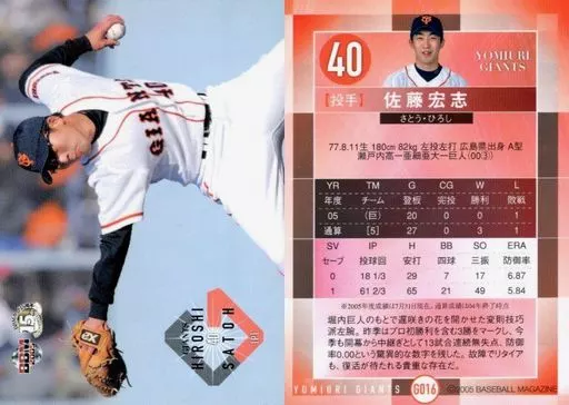 Nombre comercial en japonés: BBM/レギュラーカード/読売ジャイアンツ/BBM2005 読売ジャイアンツ G016 [レギュラーカード] : 佐藤宏志