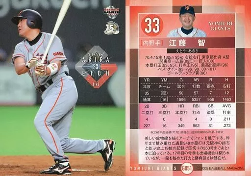 Nombre comercial en japonés: BBM/レギュラーカード/BBM2005 読売ジャイアンツ G051 [レギュラーカード] : 江藤智