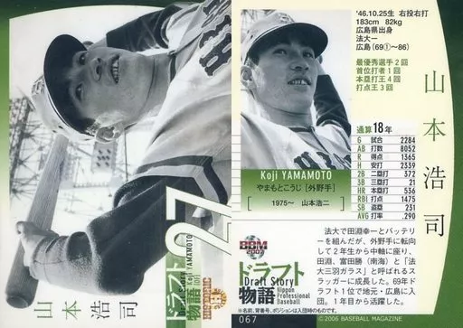 Nombre comercial en japonés: BBM/レギュラーカード/OB選手/広島東洋カープ/BBM2007 ヒストリックコレクション ドラフト物語 067 [レギュラーカード] : 山本浩司