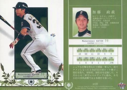 Nombre comercial en japonés: BBM/レギュラーカード/北海道日本ハムファイターズ/BBM2010 ルーキーエディションプレミアム RP20 [レギュラーカード] : 加藤政義