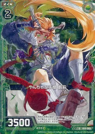 Nombre comercial en japonés: ゼクス/C/ゼクス/緑/第15弾『起動!超神器』 B15-082[C]:やんちゃな手槍 藪萩(ホログラムレア)