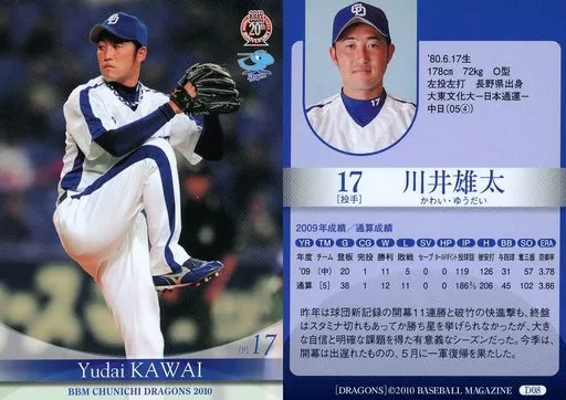 Nombre comercial en japonés: BBM/レギュラーカード/BBM2010 中日ドラゴンズ D08 [レギュラーカード] : 川井雄太