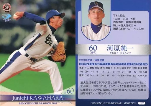 Nombre comercial en japonés: BBM/レギュラーカード/BBM2010 中日ドラゴンズ D27 [レギュラーカード] : 河原純一
