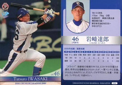 Nombre comercial en japonés: BBM/レギュラーカード/BBM2010 中日ドラゴンズ D51 [レギュラーカード] : 岩﨑達郎