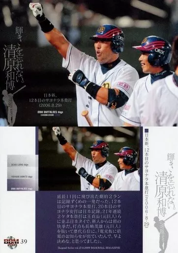 Nombre comercial en japonés: BBM/レギュラーカード/オリックス・バファローズ/BBM2009 清原和博 引退記念カード「輝きを忘れない。」 39 [レギュラーカード] : 日本新、12本めのサヨナラ本塁打(2006.8.29)