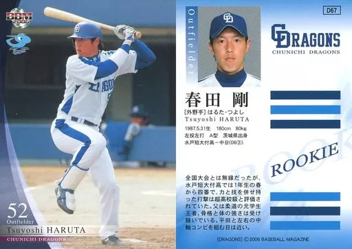 Nombre comercial en japonés: BBM/レギュラーカード/BBM2006 中日ドラゴンズ D67 [レギュラーカード] : 春田剛