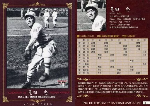 Nombre comercial en japonés: BBM/レギュラーカード/黒鷲軍/BBM2012 NO-HITTERS「PB歴代ノーヒットノーラン達成者カード」 11 [レギュラーカード] : 亀田忠