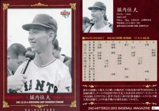 Nombre comercial en japonés: BBM/レギュラーカード/読売ジャイアンツ/BBM2012 NO-HITTERS「PB歴代ノーヒットノーラン達成者カード」 44 [レギュラーカード] : 堀内恒夫
