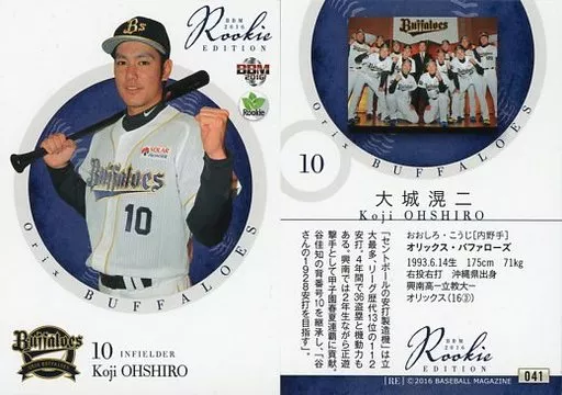 Nombre comercial en japonés: BBM/レギュラーカード/オリックス・バファローズ/BBM2016 ルーキーエディション 041 [レギュラーカード] : 大城滉二