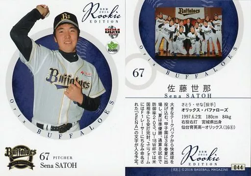 Nombre comercial en japonés: BBM/レギュラーカード/オリックス・バファローズ/BBM2016 ルーキーエディション 044 [レギュラーカード] : 佐藤世那