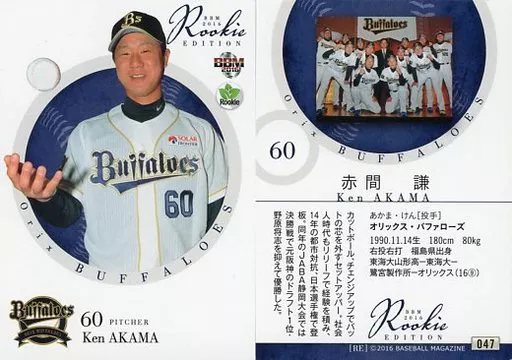 Nombre comercial en japonés: BBM/レギュラーカード/オリックス・バファローズ/BBM2016 ルーキーエディション 047 [レギュラーカード] : 赤間謙
