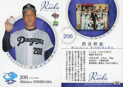 BBM / Regular Card / Chunichi Dragons / BBM2016 Rookie Edition 103 [tarjeta regular] : Mikihiro Nishihama