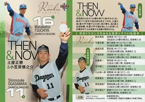 Nombre comercial en japonés: BBM/レギュラーカード/THEN&NOW/中日ドラゴンズ/BBM2016 ルーキーエディション 128 [レギュラーカード] : 土屋正勝&小笠原慎之介