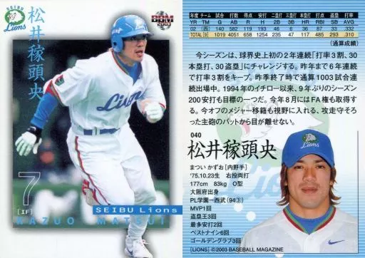 Nombre comercial en japonés: BBM/レギュラーカード/BBM2003 西武ライオンズ 040 [レギュラーカード] : 松井稼頭央