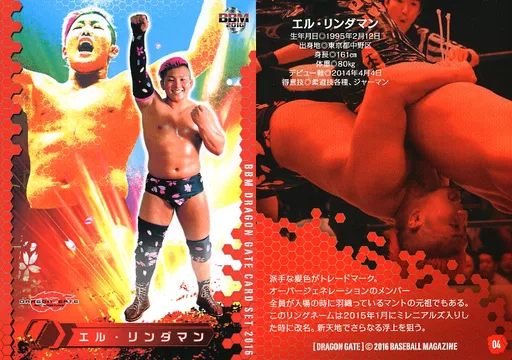 Nombre comercial en japonés: BBM/レギュラーカード/BBM2016 ドラゴンゲートカードセット 04 [レギュラーカード] : エル・リンダマン