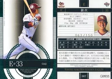 Nombre comercial en japonés: BBM/レギュラーカード/東北楽天ゴールデンイーグルス/BBM2014 ベースボールカードプレミアム ジェネシス 007[レギュラーカード]:銀次(緑箔パラレル版)(/150)