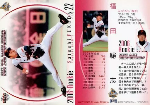 Nombre comercial en japonés: BBM/レギュラーカード/チームレギュラー/読売ジャイアンツ/BBM2007 ルーキーエディション 107 [レギュラーカード] : 福田聡志