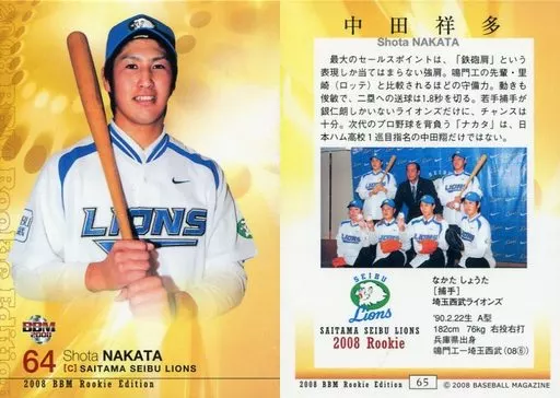 Nombre comercial en japonés: BBM/レギュラーカード//埼玉西武ライオンズ/BBM2008 Rookie Edition(ルーキー・エディション) 65 [レギュラーカード] : 中田祥多