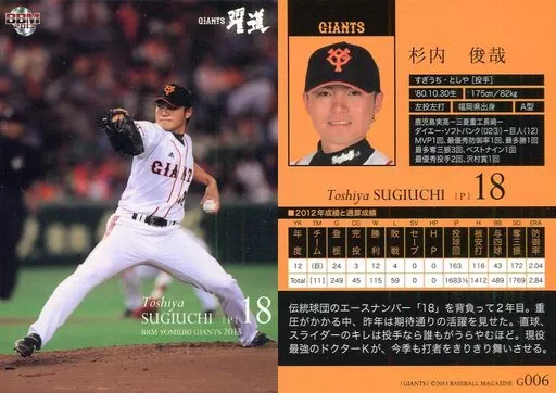 Nombre comercial en japonés: BBM/レギュラーカード/BBM2013 読売ジャイアンツ G006 [レギュラーカード] : 杉内俊哉