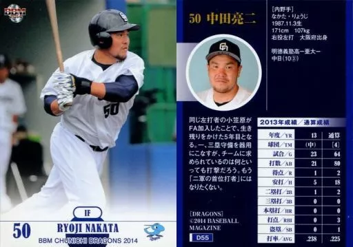 Nombre comercial en japonés: BBM/レギュラーカード/BBM2014 中日ドラゴンズ D55 [レギュラーカード] : 中田亮二