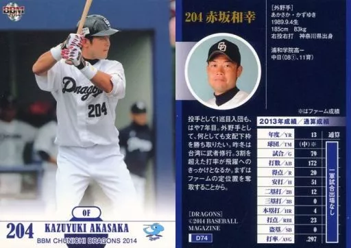 Nombre comercial en japonés: BBM/レギュラーカード/BBM2014 中日ドラゴンズ D74 [レギュラーカード] : 赤坂和幸