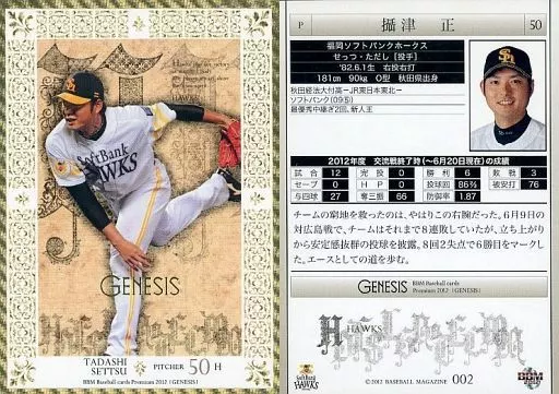 Nombre comercial en japonés: BBM/レギュラーカード/福岡ソフトバンクホークス/BBM2012 ベースボールカードプレミアム ジェネシス 002 [レギュラーカード] : 摂津正