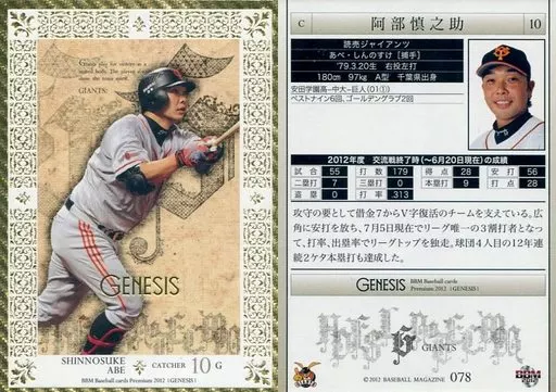 Nombre comercial en japonés: BBM/レギュラーカード/読売ジャイアンツ/BBM2012 ベースボールカードプレミアム ジェネシス 078 [レギュラーカード] : 阿部慎之助